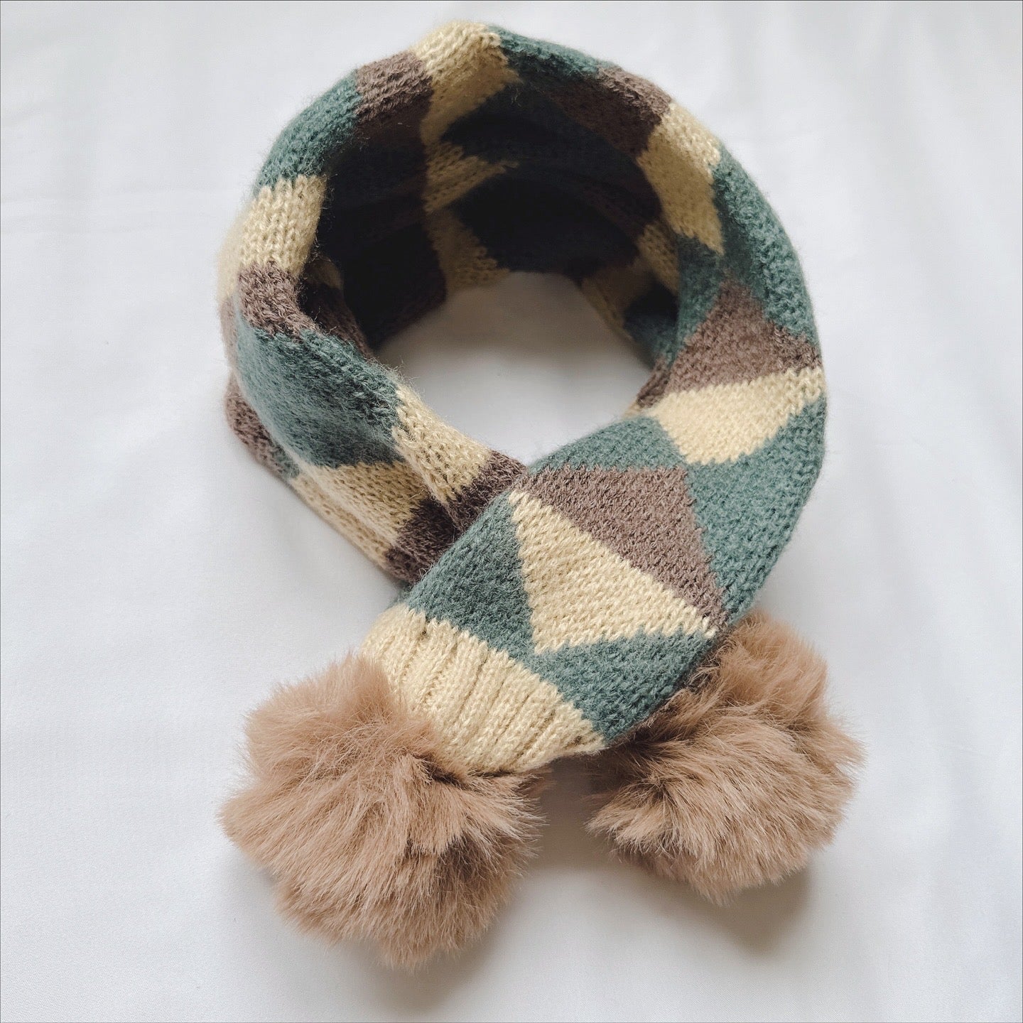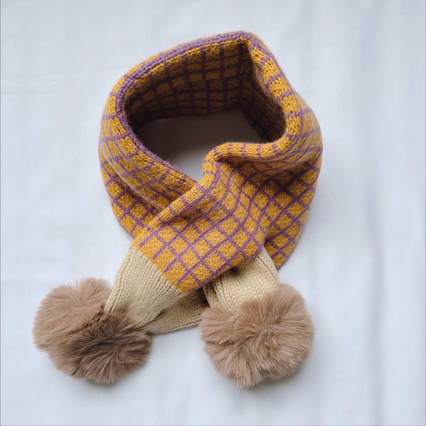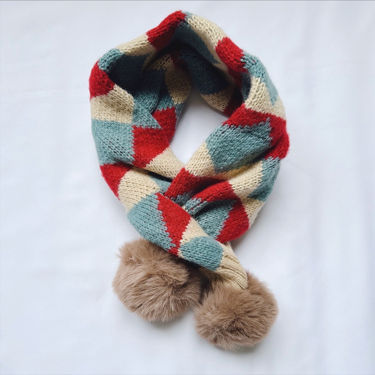 Knitted Knot Scarf with fur ball in various design.