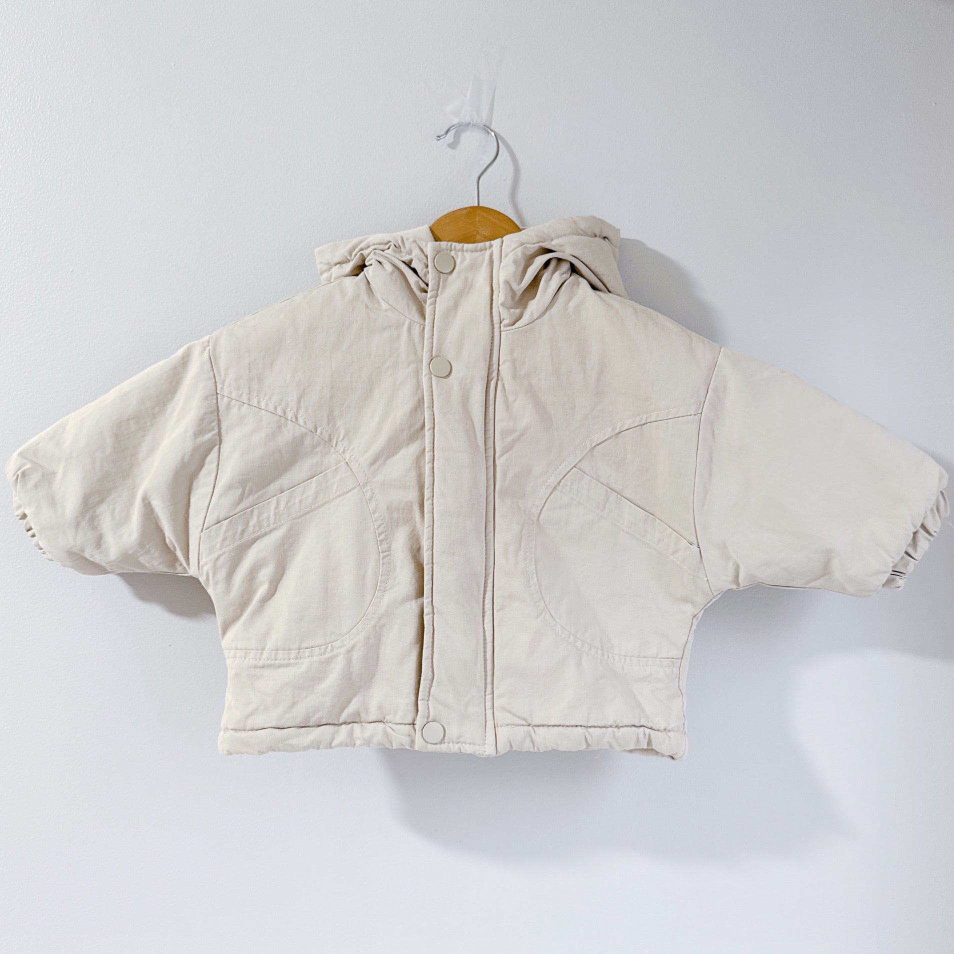 Winter Jacket with fleece lining, hoodie, side pockets and zipper.
