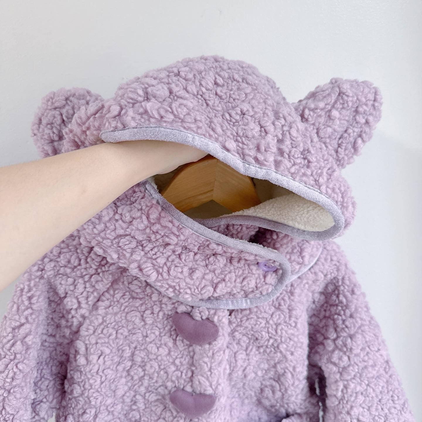 Fleece purple above the knee length coat long sleeves with decorative heart buttons, bear hoodie and 2 front pockets.