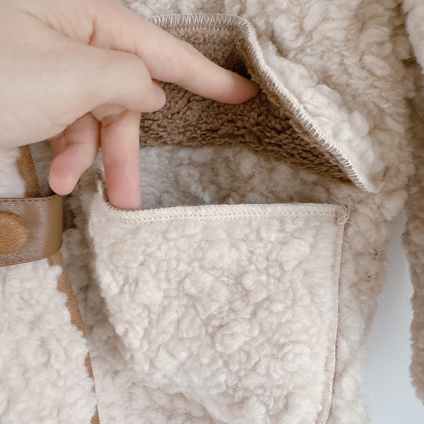 Fleece beige and brown above the knee length coat long sleeves with decorative buttons, hoodie and 2 front pockets.
